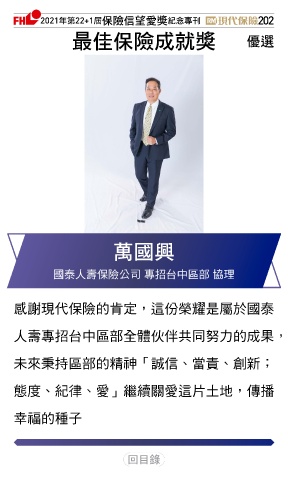 2021ϋୋ22+1֣ڭᎈڦૐฌᆤ ߏׂਖ਼̊ 202 ௰Գڭᎈϓఱᆤ Ꮄ፯ ຬጳ 國泰人壽保險公司 專招台中區部 協理 感謝現代保險的肯定,這份榮耀是屬於國泰 人壽專招台中區部全體伙伴共同努力的成果, 未來秉持區部的精神「誠信、當責、創新; 態度、紀律、愛」繼續關愛這片土地,傳播 幸福的種子 Ϋͦ
