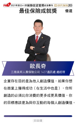 2021ϋୋ22+1֣ڭᎈڦૐฌᆤ ߏׂਖ਼̊ 203 ௰Գڭᎈϓఱᆤ Ꮄ፯ ᆄڗփ 三商美邦人壽保險公司 1437通訊處 處經理 企業存在目的是為他人創造價值,如果你想 在商業上獲得成功(在生活中也是),你所 創造的必須比你消費的更多或更具價值,你 的目標應該是為與你互動的每個人創造價值。 Ϋͦ