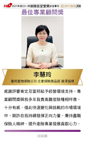 2021ϋୋ22+1֣ڭᎈڦૐฌᆤ ߏׂਖ਼̊ 208 ௰Գਖ਼ุᚥਪᆤ ҽᅆޛ 富邦產物保險公司 企業保險商品部 資深協理 感謝評審肯定及富邦給予經營環境支持,專 業顧問獎與我多年負責高難度險種相呼應, 十分有感,值此快速變化與挑戰的市場環境 中,期許自我持續發揮正向力量,秉持盡職 保險人精神,提升產險專業發展貢獻心力。 Ϋͦ