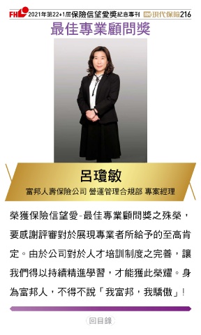 2021ϋୋ22+1֣ڭᎈڦૐฌᆤ ߏׂਖ਼̊ 216 ௰Գਖ਼ุᚥਪᆤ ѐᖘઽ 富邦人壽保險公司 營運管理合規部 專案經理 榮獲保險信望愛-最佳專業顧問獎之殊榮, 要感謝評審對於展現專業者所給予的至高肯 定。由於公司對於人才培訓制度之完善,讓 我們得以持續精進學習,才能獲此榮耀。身 為富邦人,不得不說「我富邦,我驕傲」! Ϋͦ