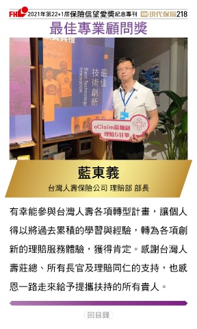 2021ϋୋ22+1֣ڭᎈڦૐฌᆤ ߏׂਖ਼̊ 218 ௰Գਖ਼ุᚥਪᆤ ᔝ؇່ 台灣人壽保險公司 理賠部 部長 有幸能參與台灣人壽各項轉型計畫,讓個人 得以將過去累積的學習與經驗,轉為各項創 新的理賠服務體驗,獲得肯定。感謝台灣人 壽莊總、所有長官及理賠同仁的支持,也感 恩一路走來給予提攜扶持的所有貴人。 Ϋͦ