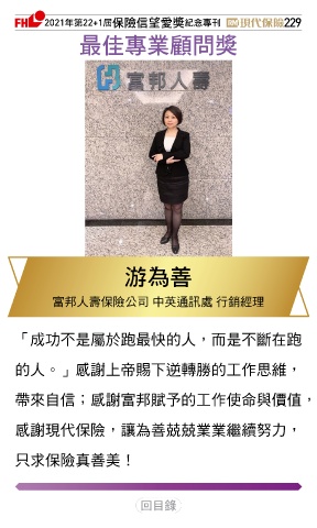 2021ϋୋ22+1֣ڭᎈڦૐฌᆤ ߏׂਖ਼̊ 229 ௰Գਖ਼ุᚥਪᆤ ದމഛ 富邦人壽保險公司 中英通訊處 行銷經理 「成功不是屬於跑最快的人,而是不斷在跑 的人。」感謝上帝賜下逆轉勝的工作思維, 帶來自信;感謝富邦賦予的工作使命與價值, 感謝現代保險,讓為善兢兢業業繼續努力, 只求保險真善美! Ϋͦ