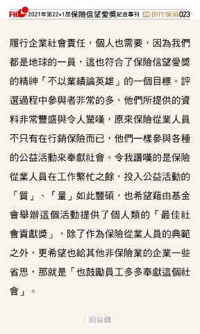 的公益活動來奉獻社會。令我讚嘆的是保險