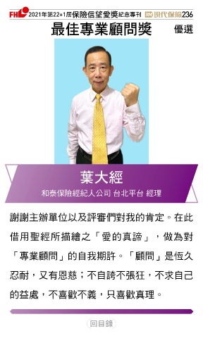 2021ϋୋ22+1֣ڭᎈڦૐฌᆤ ߏׂਖ਼̊ 236 ௰Գਖ਼ุᚥਪᆤ Ꮄ፯ ɽ 和泰保險經紀人公司 台北平台 經理 謝謝主辦單位以及評審們對我的肯定。在此 借用聖經所描繪之「愛的真諦」,做為對 「專業顧問」的自我期許。「顧問」是恆久 忍耐,又有恩慈;不自誇不張狂,不求自己 的益處,不喜歡不義,只喜歡真理。 Ϋͦ
