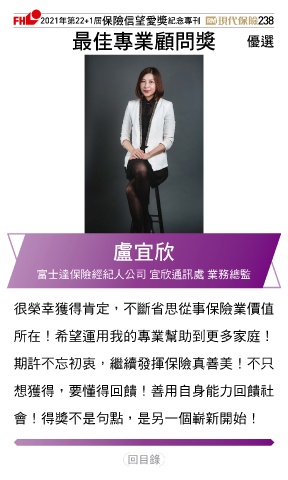 2021ϋୋ22+1֣ڭᎈڦૐฌᆤ ߏׂਖ਼̊ 238 ௰Գਖ਼ุᚥਪᆤ Ꮄ፯ ጅؚ֝ 富士達保險經紀人公司 宜欣通訊處 業務總監 很榮幸獲得肯定,不斷省思從事保險業價值 所在!希望運用我的專業幫助到更多家庭! 期許不忘初衷,繼續發揮保險真善美!不只 想獲得,要懂得回饋!善用自身能力回饋社 會!得獎不是句點,是另一個嶄新開始! Ϋͦ