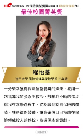 2021ϋୋ22+1֣ڭᎈڦૐฌᆤ ߏׂਖ਼̊ 241 ௰Գࣧവߵᆤ ➲ 逢甲大學 風險管理與保險學系 三年級 十分榮幸獲得保險信望愛獎的殊榮,感謝一 路指導我的張永郎教授,鼓勵我不斷的進步, 讓我在求學過程中,從認識到認同保險的價 值。獲得這份鼓勵,讓我確信自己持續在保 險領域投入的熱忱,為這個產業貢獻。 Ϋͦ