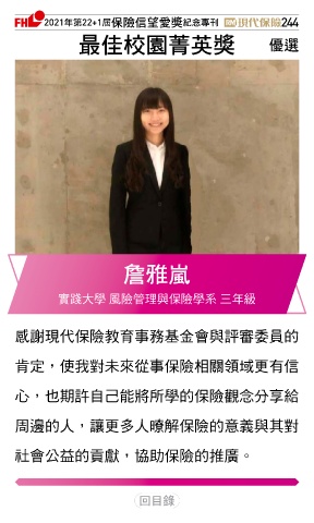2021ϋୋ22+1֣ڭᎈڦૐฌᆤ ߏׂਖ਼̊ 244 ௰Գࣧവߵᆤ Ꮄ፯ ༗ඩళ 實踐大學 風險管理與保險學系 三年級 感謝現代保險教育事務基金會與評審委員的 肯定,使我對未來從事保險相關領域更有信 心,也期許自己能將所學的保險觀念分享給 周邊的人,讓更多人暸解保險的意義與其對 社會公益的貢獻,協助保險的推廣。 Ϋͦ