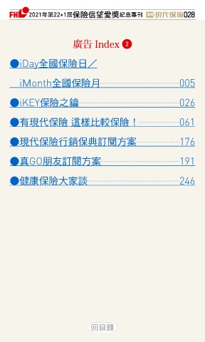 2021ϋୋ22+1֣ڭᎈڦૐฌᆤ ߏׂਖ਼̊ 028 廣告 Index 2 ●iDay全國保險日/ iMonth全國保險月 005 ●iKEY保險之鑰 026 ●有現代保險 這樣比較保險! 061 ●現代保險行銷保典訂閱方案 176 ●真GO朋友訂閱方案 191 ●健康保險大家談 246 Ϋͦ