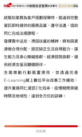 2021ϋୋ22+1֣ڭᎈڦૐฌᆤ ߏׂਖ਼̊ 036 統幫助業務為客戶規劃保障時,能達到完整 資訊即時提供的服務品質,遵守法遵,協助 同仁完成法規課程。 發揮雪中送炭、濟弱扶貧的精神,將有限資 源做合理分配,鎖定缺乏生活自理能力、謀 生能力及身心障礙族群、經濟弱勢族群,提 供經濟支援及關懷陪伴。 全面推動行動裝置使用,並透過完善 E-Learning線上數位平台改善工作績效, 提升業務同仁資訊E化效率,疫情期間突破 時間及地域性,達到全方位的訓練。 Ϋͦ