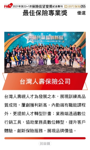 2021ϋୋ22+1֣ڭᎈڦૐฌᆤ ߏׂਖ਼̊ 055 ௰Գڭᎈਖ਼ุᆤ Ꮄ፯ ̨ᝄɛྪڭᎈʮ̡ 台灣人壽視人才為發展之本,展現訓練高品 質成效,屢創獲利新高。內勤端有職能課程 外,更提前人才轉型計畫;業務端透過數位 行銷工具,協助業務員數位轉型,提升客戶 體驗,創新保險服務,展現品牌價值。 Ϋͦ