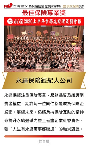 2021ϋୋ22+1֣ڭᎈڦૐฌᆤ ߏׂਖ਼̊ 059 ௰Գڭᎈਖ਼ุᆤ ͑༺ڭᎈߏɛʮ̡ 永達保經注重保險專業、服務品質及維護消 費者權益,期許每一位同仁都能成為保險企 業家。展望未來,仍將秉持保險互助的精神 來提升永續競爭力並且善盡企業社會責任, 朝〝人生有永達萬事都騰達〞的願景邁進。 Ϋͦ