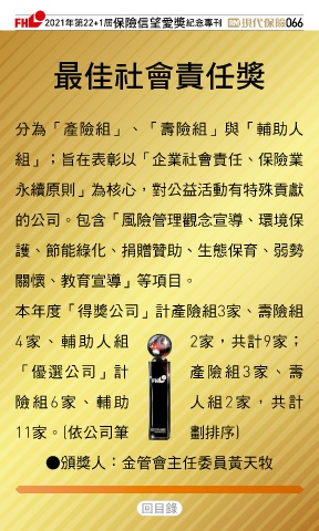 組」;旨在表彰以「企業社會責任、保險業