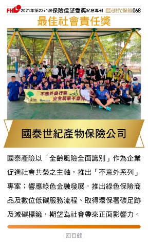 2021ϋୋ22+1֣ڭᎈڦૐฌᆤ ߏׂਖ਼̊ 068 ௰Գٟึபᆤ इ˰ߏପيڭᎈʮ̡ 國泰產險以「全齡風險全面識別」作為企業 促進社會共榮之主軸,推出「不意外系列」 專案;響應綠色金融發展,推出綠色保險商 品及數位低碳服務流程、取得環保署碳足跡 及減碳標籤,期望為社會帶來正面影響力。 Ϋͦ