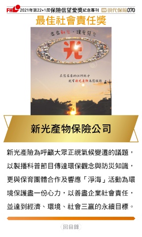 2021ϋୋ22+1֣ڭᎈڦૐฌᆤ ߏׂਖ਼̊ 070 ௰Գٟึபᆤ อΈପيڭᎈʮ̡ 新光產險為呼籲大眾正視氣候變遷的議題, 以製播科普節目傳達環保觀念與防災知識, 更與保育團體合作及響應「淨海」活動為環 境保護盡一份心力,以善盡企業社會責任, 並達到經濟、環境、社會三贏的永續目標。 Ϋͦ