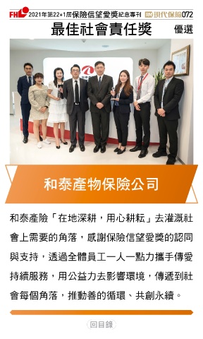 2021ϋୋ22+1֣ڭᎈڦૐฌᆤ ߏׂਖ਼̊ 072 ௰Գٟึபᆤ Ꮄ፯ ձइପيڭᎈʮ̡ 和泰產險「在地深耕,用心耕耘」去灌溉社 會上需要的角落,感謝保險信望愛獎的認同 與支持,透過全體員工一人一點力攜手傳愛 持續服務,用公益力去影響環境,傳遞到社 會每個角落,推動善的循環、共創永續。 Ϋͦ
