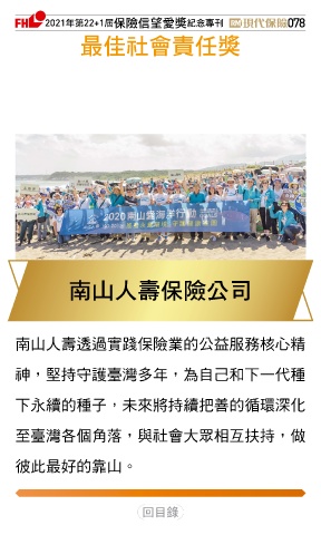 2021ϋୋ22+1֣ڭᎈڦૐฌᆤ ߏׂਖ਼̊ 078 ௰Գٟึபᆤ یʆɛྪڭᎈʮ̡ 南山人壽透過實踐保險業的公益服務核心精 神,堅持守護臺灣多年,為自己和下一代種 下永續的種子,未來將持續把善的循環深化 至臺灣各個角落,與社會大眾相互扶持,做 彼此最好的靠山。 Ϋͦ