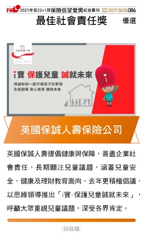 2021ϋୋ22+1֣ڭᎈڦૐฌᆤ ߏׂਖ਼̊ 086 ௰Գٟึபᆤ Ꮄ፯ ߵڭ༐ɛྪڭᎈʮ̡ 英國保誠人壽提倡健康與保障,善盡企業社 會責任,長期關注兒童議題,涵蓋兒童安 全、健康及理財教育面向。去年更積極倡議, 以思維領導推出「i寶-保護兒童誠就未來」, 呼籲大眾重視兒童議題,深受各界肯定。 Ϋͦ