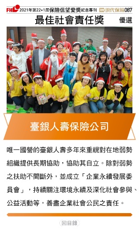 2021ϋୋ22+1֣ڭᎈڦૐฌᆤ ߏׂਖ਼̊ 087 ௰Գٟึபᆤ Ꮄ፯ ၽვɛྪڭᎈʮ̡ 唯一國營的臺銀人壽多年來重視對在地弱勢 組織提供長期協助,協助其自立。除對弱勢 之扶助不間斷外,並成立「企業永續發展委 員會」,持續關注環境永續及深化社會參與、 公益活動等,善盡企業社會公民之責任。 Ϋͦ