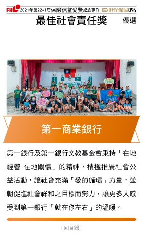 2021ϋୋ22+1֣ڭᎈڦૐฌᆤ ߏׂਖ਼̊ 094 ௰Գٟึபᆤ Ꮄ፯ ୋɓਠุვБ 第一銀行及第一銀行文教基金會秉持「在地 經營 在地關懷」的精神,積極推廣社會公 益活動,讓社會充滿「愛的循環」力量,並 朝促進社會祥和之目標而努力,讓更多人感 受到第一銀行「就在你左右」的溫暖。 Ϋͦ