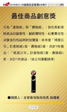 2021ϋୋ22+1֣ڭᎈڦૐฌᆤ ߏׂਖ਼̊ 095 ௰Գਠۜ௴จᆤ 分為「產險組」與「壽險組」;旨在表彰保 險商品的創意性、創新獨特性、社會責任性、 消費者的效益與附加價值。本年度「得獎公 司」計產險組4家,壽險組5家,共計9件商 品;「優選公司」計產險組5家、壽險組4 家,共計9件商品。(依公司筆劃排序) ●頒獎人:金管會保險局局長 施瓊華 Ϋͦ
