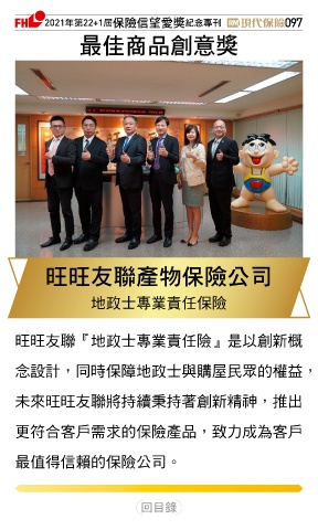 2021ϋୋ22+1֣ڭᎈڦૐฌᆤ ߏׂਖ਼̊ 097 ௰Գਠۜ௴จᆤ ʾᑌପيڭᎈʮ̡ 地政士專業責任保險 旺旺友聯『地政士專業責任險』是以創新概 念設計,同時保障地政士與購屋民眾的權益, 未來旺旺友聯將持續秉持著創新精神,推出 更符合客戶需求的保險產品,致力成為客戶 最值得信賴的保險公司。 Ϋͦ