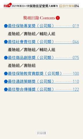 2021ϋୋ22+1֣ڭᎈڦૐฌᆤ ɝఖਖ਼̊ 014 獎項目錄 Contents 1 ● 最佳保險專業獎(公司類) 019 產險組/壽險組/輔助人組 ● 最佳社會責任獎(公司類) 046 產險組/壽險組/輔助人組 ● 最佳商品創意獎(公司類) 075 產險組/壽險組 ● 最佳保險教育貢獻獎(公司類) 100 ● 最佳通路策略獎(公司類) 110 ● 最佳整合傳播獎(公司類) 122 Ϋͦ
