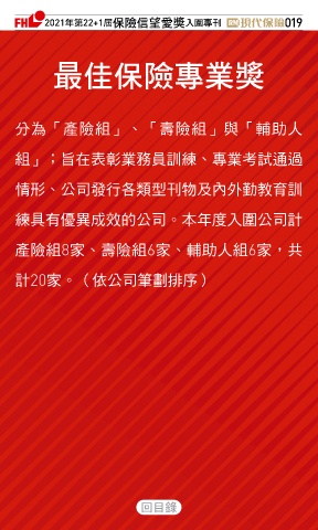 2021ϋୋ22+1֣ڭᎈڦૐฌᆤ ɝఖਖ਼̊ 019 ௰Գڭᎈਖ਼ุᆤ 分為「產險組」、「壽險組」與「輔助人 組」;旨在表彰業務員訓練、專業考試通過 情形、公司發行各類型刊物及內外勤教育訓 練具有優異成效的公司。本年度入圍公司計 產險組8家、壽險組6家、輔助人組6家,共 計20家。(依公司筆劃排序) Ϋͦ