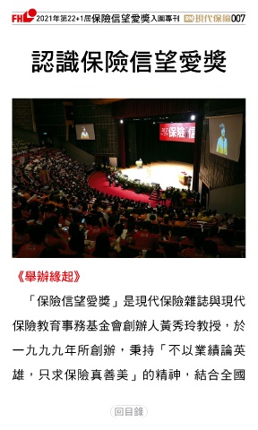 2021ϋୋ22+1֣ڭᎈڦૐฌᆤ ɝఖਖ਼̊ 007 Ⴉᗆڭᎈڦૐฌᆤ ᑘ፬ᇝৎ 「保險信望愛獎」是現代保險雜誌與現代 保險教育事務基金會創辦人黃秀玲教授,於 一九九九年所創辦,秉持「不以業績論英 雄,只求保險真善美」的精神,結合全國 Ϋͦ