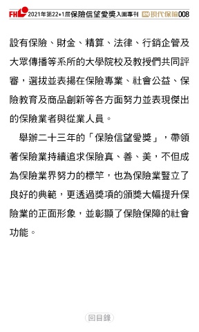 2021ϋୋ22+1֣ڭᎈڦૐฌᆤ ɝఖਖ਼̊ 008 設有保險、財金、精算、法律、行銷企管及 大眾傳播等系所的大學院校及教授們共同評 審,選拔並表揚在保險專業、社會公益、保 險教育及商品創新等各方面努力並表現傑出 的保險業者與從業人員。 舉辦二十三年的「保險信望愛獎」,帶領 著保險業持續追求保險真、善、美,不但成 為保險業界努力的標竿,也為保險業豎立了 良好的典範,更透過獎項的頒獎大幅提升保 險業的正面形象,並彰顯了保險保障的社會 功能。 Ϋͦ