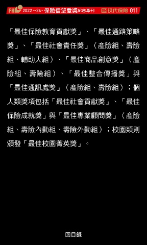 2022 24 ڭᎈڦૐฌᆤ ߏׂਖ਼̊ 011 th the 「最佳保險教育貢獻獎」、「最佳通路策略 獎」、「最佳社會責任獎」(產險組、壽險 組、輔助人組)、「最佳商品創意獎」(產 險組、壽險組)、「最佳整合傳播獎」與 「最佳通訊處獎」(產險組、壽險組);個 人類獎項包括「最佳社會貢獻獎」、「最佳 保險成就獎」與「最佳專業顧問獎」(產險 組、壽險內勤組、壽險外勤組);校園類則 頒發「最佳校園菁英獎」。 Ϋͦ