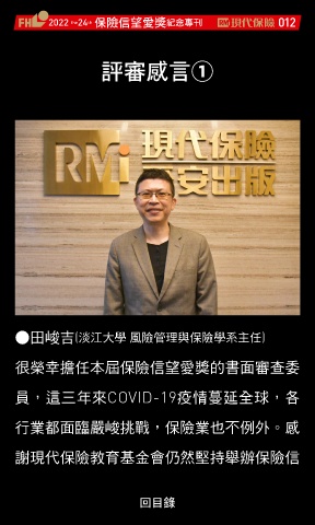 2022 24 ڭᎈڦૐฌᆤ ߏׂਖ਼̊ 012 th the ൙ᄲชԊ① ●田峻吉(淡江大學 風險管理與保險學系主任) 很榮幸擔任本屆保險信望愛獎的書面審查委 員,這三年來COVID-19疫情蔓延全球,各 行業都面臨嚴峻挑戰,保險業也不例外。感 謝現代保險教育基金會仍然堅持舉辦保險信 Ϋͦ