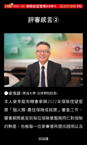 2022 24 ڭᎈڦૐฌᆤ ߏׂਖ਼̊ 014 th the ൙ᄲชԊ② ●卓俊雄 (東海大學 法律學院院長) 本人榮幸能有機會參與2022年保險信望愛 獎「個人類-最佳保險成就獎」審查工作。 審查期間感受到每位保險業服務同仁對保險 的熱愛,也被每一位參賽者所提出說明以及 Ϋͦ