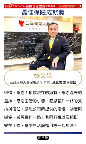 2022 24 ڭᎈڦૐฌᆤ ߏׂਖ਼̊ 153 the th ௰Գڭᎈϓఱᆤ ੵ˖ 三商美邦人壽保險公司 17860通訊處 業務總監 珍惜、感恩!珍惜現在的擁有,感恩過去的 選擇。感恩主管的引導,感恩客戶一路的支 持與信任,感恩公司所提供的環境、制度與 機會,感恩夥伴一路上共同打拼以及相挺, 樂在工作、享受生活前進目標一起加油! Ϋͦ