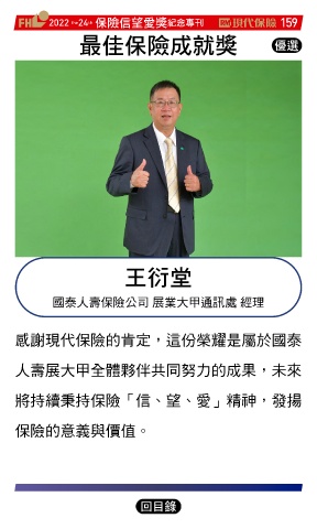 2022 24 ڭᎈڦૐฌᆤ ߏׂਖ਼̊ 159 the th ௰Գڭᎈϓఱᆤ Ꮄ፯ ˮࠃੀ 國泰人壽保險公司 展業大甲通訊處 經理 感謝現代保險的肯定,這份榮耀是屬於國泰 人壽展大甲全體夥伴共同努力的成果,未來 將持續秉持保險「信、望、愛」精神,發揚 保險的意義與價值。 Ϋͦ