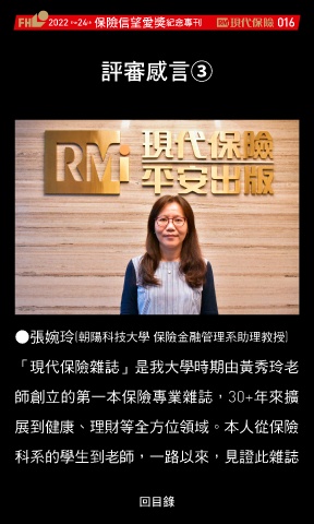 2022 24 ڭᎈڦૐฌᆤ ߏׂਖ਼̊ 016 th the ൙ᄲชԊ③ ●張婉玲(朝陽科技大學 保險金融管理系助理教授) 「現代保險雜誌」是我大學時期由黃秀玲老 師創立的第一本保險專業雜誌,30+年來擴 展到健康、理財等全方位領域。本人從保險 科系的學生到老師,一路以來,見證此雜誌 Ϋͦ