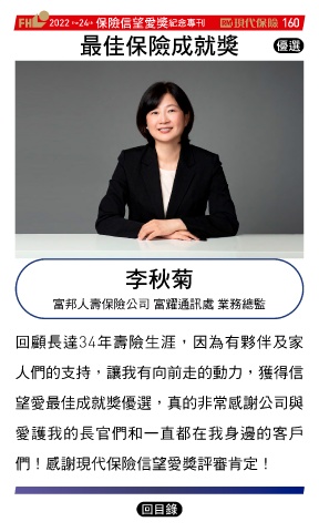 2022 24 ڭᎈڦૐฌᆤ ߏׂਖ਼̊ 160 th the ௰Գڭᎈϓఱᆤ Ꮄ፯ ҽ߇ീ 富邦人壽保險公司 富耀通訊處 業務總監 回顧長達34年壽險生涯,因為有夥伴及家 人們的支持,讓我有向前走的動力,獲得信 望愛最佳成就獎優選,真的非常感謝公司與 愛護我的長官們和一直都在我身邊的客戶 們!感謝現代保險信望愛獎評審肯定! Ϋͦ