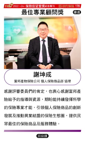 2022 24 ڭᎈڦૐฌᆤ ߏׂਖ਼̊ 170 th the ௰Գਖ਼ุᚥਪᆤ Ꮄ፯ ᑽտϓ 富邦產物保險公司 個人保險商品部 協理 感謝評審委員們的肯定,也衷心感謝富邦產 險給予的指導與資源,期盼能持續發揮所學 的保險專業才能,引領個人保險商品的創新 發展及推動異業結盟的保險生態圈,提供民 眾最佳的保險商品及服務體驗。 Ϋͦ