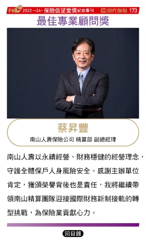 2022 24 ڭᎈڦૐฌᆤ ߏׂਖ਼̊ 173 th the ௰Գਖ਼ุᚥਪᆤ ᇹᔮ 南山人壽保險公司 精算部 副總經理 南山人壽以永續經營、財務穩健的經營理念, 守護全體保戶人身風險安全。感謝主辦單位 肯定,獲頒榮譽背後也是責任,我將繼續帶 領南山精算團隊迎接國際財務新制接軌的轉 型挑戰,為保險業貢獻心力。 Ϋͦ
