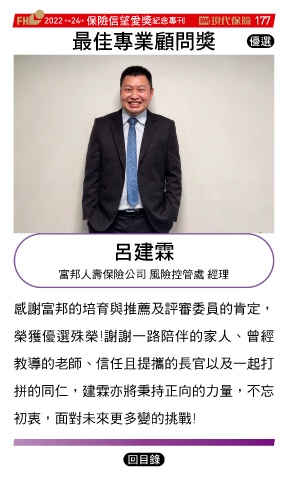 2022 24 ڭᎈڦૐฌᆤ ߏׂਖ਼̊ 177 th the ௰Գਖ਼ุᚥਪᆤ Ꮄ፯ ѐܔᎌ 富邦人壽保險公司 風險控管處 經理 感謝富邦的培育與推薦及評審委員的肯定, 榮獲優選殊榮!謝謝一路陪伴的家人、曾經 教導的老師、信任且提攜的長官以及一起打 拼的同仁,建霖亦將秉持正向的力量,不忘 初衷,面對未來更多變的挑戰! Ϋͦ