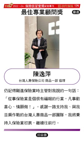 2022 24 ڭᎈڦૐฌᆤ ߏׂਖ਼̊ 179 th the ௰Գਖ਼ุᚥਪᆤ Ꮄ፯ අറ 台灣人壽保險公司 商品一部 協理 仍記得剛進保險業時主管對我說的一句話: 「從事保險業是個很有福報的行業,凡事歡 喜心、情願做!」。感謝一路支持我、與我 並肩作戰的台灣人壽商品一部團隊,我將秉 持入保險業初衷,繼續往前行。 Ϋͦ