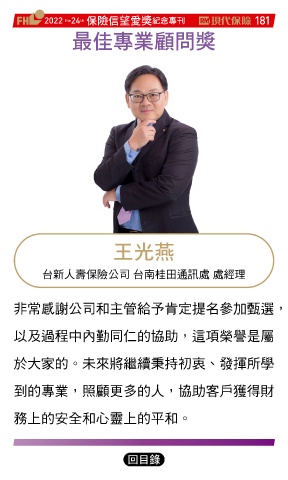 2022 24 ڭᎈڦૐฌᆤ ߏׂਖ਼̊ 181 the th ௰Գਖ਼ุᚥਪᆤ ˮΈዲ 台新人壽保險公司 台南桂田通訊處 處經理 非常感謝公司和主管給予肯定提名參加甄選, 以及過程中內勤同仁的協助,這項榮譽是屬 於大家的。未來將繼續秉持初衷、發揮所學 到的專業,照顧更多的人,協助客戶獲得財 務上的安全和心靈上的平和。 Ϋͦ