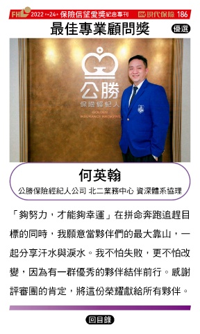 2022 24 ڭᎈڦૐฌᆤ ߏׂਖ਼̊ 186 the th ௰Գਖ਼ุᚥਪᆤ Ꮄ፯ Оߵጫ 公勝保險經紀人公司 北二業務中心 資深體系協理 「夠努力,才能夠幸運」在拼命奔跑追趕目 標的同時,我願意當夥伴們的最大靠山,一 起分享汗水與淚水。我不怕失敗,更不怕改 變,因為有一群優秀的夥伴結伴前行。感謝 評審團的肯定,將這份榮耀獻給所有夥伴。 Ϋͦ