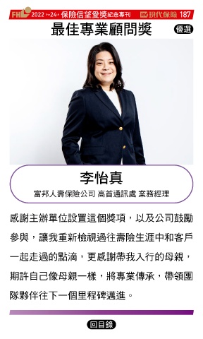 2022 24 ڭᎈڦૐฌᆤ ߏׂਖ਼̊ 187 th the ௰Գਖ਼ุᚥਪᆤ Ꮄ፯ ҽॆ 富邦人壽保險公司 高首通訊處 業務經理 感謝主辦單位設置這個獎項,以及公司鼓勵 參與,讓我重新檢視過往壽險生涯中和客戶 一起走過的點滴,更感謝帶我入行的母親, 期許自己像母親一樣,將專業傳承,帶領團 隊夥伴往下一個里程碑邁進。 Ϋͦ