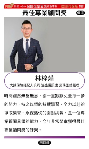 2022 24 ڭᎈڦૐฌᆤ ߏׂਖ਼̊ 189 the th ௰Գਖ਼ุᚥਪᆤ Ꮄ፯ ؍⮶ 大誠保險經紀人公司 達盛通訊處 業務副總經理 時間雖然無聲無息,卻一直默默丈量每一步 的努力,持之以恆的持續學習、全力以赴的 爭取榮譽、永保熱忱的面對挑戰,是一位專 業顧問具備的能力,今年非常榮幸獲得最佳 專業顧問獎的殊榮。 Ϋͦ