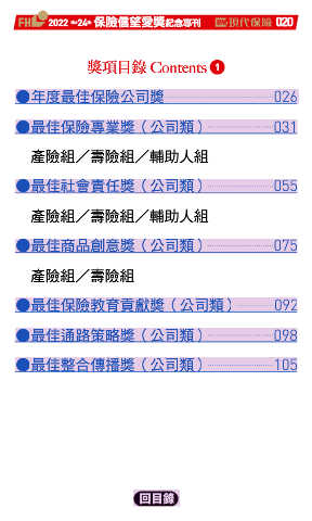 2022 24 ڭᎈڦૐฌᆤ ߏׂਖ਼̊ 020 th the 獎項目錄 Contents 1 ● 年度最佳保險公司獎 026 ● 最佳保險專業獎(公司類) 031 產險組/壽險組/輔助人組 ● 最佳社會責任獎(公司類) 055 產險組/壽險組/輔助人組 ● 最佳商品創意獎(公司類) 075 產險組/壽險組 ● 最佳保險教育貢獻獎(公司類) 092 ● 最佳通路策略獎(公司類) 098 ● 最佳整合傳播獎(公司類) 105 Ϋͦ