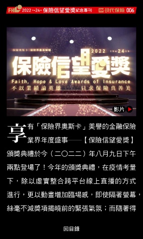 2022 24 ڭᎈڦૐฌᆤ ߏׂਖ਼̊ 006 th the ᅂ˪ 享 有「保險界奧斯卡」美譽的金融保險 業界年度盛事――【保險信望愛獎】 頒獎典禮於今(二○二二)年八月九日下午 兩點登場了!今年的頒獎典禮,在疫情考量 下,除以虛實整合跨平台線上直播的方式 進行,更以動畫增加臨場感,即使隔著螢幕, 絲毫不減獎項揭曉前的緊張氣氛;而隨著得 Ϋͦ
