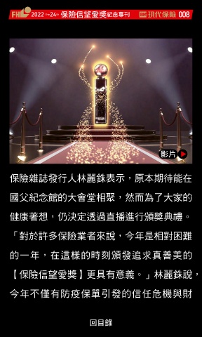 2022 24 ڭᎈڦૐฌᆤ ߏׂਖ਼̊ 008 the th ᅂ˪ 保險雜誌發行人林麗銖表示,原本期待能在 國父紀念館的大會堂相聚,然而為了大家的 健康著想,仍決定透過直播進行頒獎典禮。 「對於許多保險業者來說,今年是相對困難 的一年,在這樣的時刻頒發追求真善美的 【保險信望愛獎】更具有意義。」林麗銖說, 今年不僅有防疫保單引發的信任危機與財 Ϋͦ