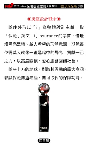 2024 26 ڭᎈڦૐฌᆤ ɝఖਖ਼̊ 010 the th ◉獎座設計理念◉ 獎座外形以「i」為整體設計主軸,取 「保險」英文「i」nsurance的字首,借蠟 燭照亮黑暗、給人希望的形體意涵,期勉每 位得獎人就像一盞黑暗中的燭光,貢獻一己 之力,以高度關懷、愛心服務回饋社會。 獎座上方的地球,則取其圓融的廣大意涵, 彰顯保險無遠弗屆、無可取代的保障功能。 Ϋͦ