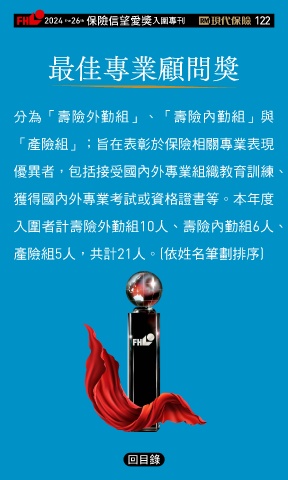 2024 26 ڭᎈڦૐฌᆤ ɝఖਖ਼̊ 122 the th 最佳專業顧問獎 分為「壽險外勤組」、「壽險內勤組」與 「產險組」;旨在表彰於保險相關專業表現 優異者,包括接受國內外專業組織教育訓練、 獲得國內外專業考試或資格證書等。本年度 入圍者計壽險外勤組10人、壽險內勤組6人、 產險組5人,共計21人。(依姓名筆劃排序) Ϋͦ