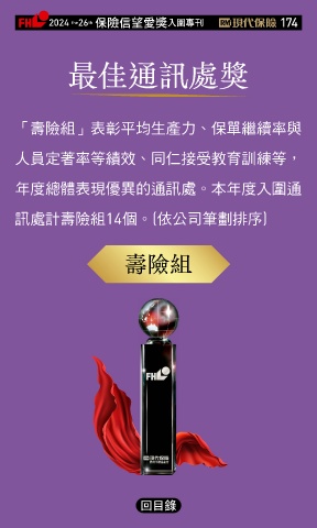 2024 26 ڭᎈڦૐฌᆤ ɝఖਖ਼̊ 174 the th 最佳通訊處獎 「壽險組」表彰平均生產力、保單繼續率與 人員定著率等績效、同仁接受教育訓練等, 年度總體表現優異的通訊處。本年度入圍通 訊處計壽險組14個。(依公司筆劃排序) 壽險組 Ϋͦ